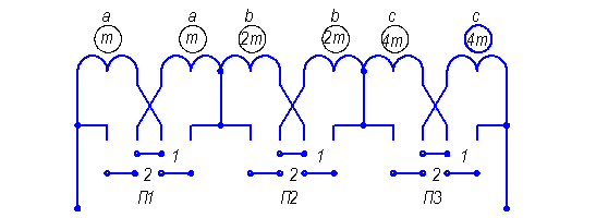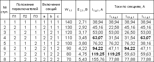 Рисунок 3 - Схема первичной обмотки трансформатора. Количество ступеней n регулирования вторичной ЭДС ровно 8, n=8. Расчетной ступенью, для которой назначены ток I2. p. и ЭДС Е2. р., является предпоследней (Е2. р. =Е2.7). На этой ступени выполняется сварка. Кратность регулирования вторичной ЭДС согласно ГОСТ 297-80 принимаю равной К=2 (для машин с повышенной стабильностью). Количество вторичных витков принимаю равным W2=1 при Е2. р<12-14 В. Определим число витков первичной обмотки на каждой ступени. На предпоследней ступени число витков первичной обмотки равно С другой стороны: От сюда следует, что - Принимаю m= Учитывая соотношение числа витков первичной обмотки по секциям: определим значения Wa, Wb, Wc. Wa=m=Wb=2m= Wc=4m= Число витков первичной обмотки на каждой ступени: Вторичная ЭДС на всех ступенях определяется по уравнению: Далее рассчитаю длительные первичные токи на всех ступенях по уравнению: гдеI1. д. р. - длительный первичный ток на расчётной ступени. Он рассчитывается по формуле: где К0 - коэффициент, учитывающий ток холостого хода; К0=1,06 I2. д. н. - номинальный длительный вторичный ток; W2 - количество вторичных витков; W1. n-1 - число витков первичной обмотки на расчётной ступени. Тогда длительные первичные токи на всех ступенях равняются: Таблица 4 - Первичная обмотка трансформатора