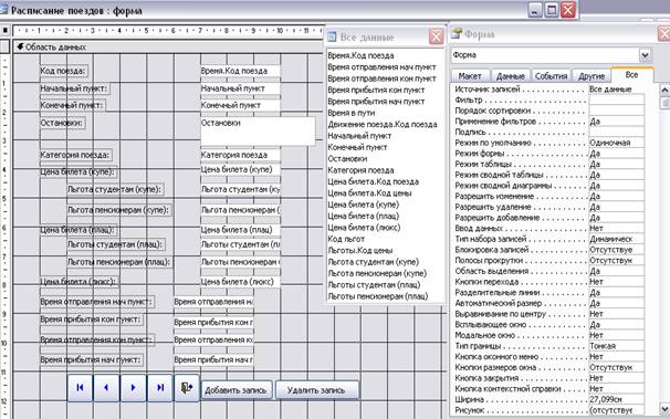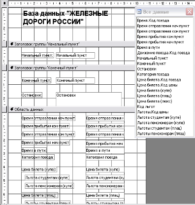 Рис. 9 8. Перейдем к созданию отчета. Отчеты используются для предоставления данных в удобном виде. Отчет можно вывести на экран или распечатать на принтере. В отчете можно группировать и сортировать данные в любом порядке. Начинать работу нужно с общего представления о макете отчета. После разработки общего формата отчета следует подобрать необходимые данные. В отчете можно использовать данные из одной таблицы базы данных или результирующий набор данных запроса. Необходимо получить данные об отдельно взятом поезде и параметрах его передвижения. Отчет создадим в режиме Конструктора. Для начала добавим Заголовок отчета, который будет использоваться в качестве титульной страницы: База данных: «ЖЕЛЕЗНЫЕ ДОРОГИ РОССИИ». Затем откроем запрос Все данные, возьмем из него поля: Время отправления нач пункт, Время прибытия кон пункт, Время отправления кон пункт, Время прибытия нач пункт, Время в пути, Категория поезда, Цена билета (купе), Льгота студентам (купе), Льгота пенсионерам (купе) Цена билета (плац), Льгота студентам (плац), Льгота пенсионерам (плац), Цена билета (люкс) и переместим в область данных. В данной таблице будет два уровня группировки. Для их создания находим на панели инструментов кнопку Сортировка и группировка. В поле/выражение ставим поле Начальный пункт и Конечный пункт В свойствах изменяем заголовок группы – да. В появившиеся заголовки группы для «Начальный пункт» перетаскиваем поле Начальный пункт, для «Конечный пункт» - Конечный пункт и Остановки. Затем нажимаем на Вид и сохраняем отчет под именем Отчет – РЖД (Рис. 10, 11).