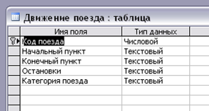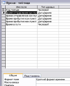 Рис. 1 2. Таким же образом создаем таблицу Время. В ней будут хранится данные: время отправления (нач. – конеч. пункт), время прибытия (нач. – конеч. пункт), время в пути. Все поля кроме кода поезда и времени пути (числовые поля) будут иметь тип данных: дата\время. В общих свойствах этих полей в строке формат поля выбираем “Краткий формат времени” - который означает, что данные в этой строке будут иметь вид – 00:00 (Рис.2).