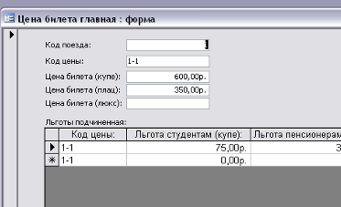 Рис. 8 б) Внешний вид созданной формы Создадим форму Цена билета главная, источником записей будет таблица Цена билета. Также создадим форму Льготы подчиненная. Подчиненные формы предоставляют большую гибкость при отображении и вводе данных из нескольких таблиц. Здесь можно даже редактировать все поля, не задумываясь о целостности данных и вводить данные в форму с отношением один-ко-многим (подчиненная форма – это форма внутри формы, которая позволяет использовать данные из нескольких в одной форме). Теперь подчиненную форму нужно вставить во вновь созданную. Самый простой способ – отобразить главную форму и перетащить подчиненную форму в главную. При этом автоматически будет создан элемент управления подчиненной формы и потенциальные связи между формами (Рис. 9). Для создания связи вручную надо в свойствах подчиненной формы указать Код цены для свойства Основные поля и Код цены для свойства Подчиненные поля.