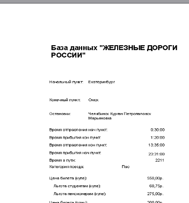 Рис. 11. Внешний вид созданного отчета 9. Макросы Access. Довольно часто макросы используют для поиска определенных записей в базе. Эти макросы используют две макрокоманды: КЭлементуУправления и НайтиЗапись. Можно добавить к созданной форме подпрограмму поиска расписания поездов по начальному и конечному пункту (т.е. если выбрать из списка какой-либо пункт, то автоматически выводятся расписание этого поезда) (Рис. 12).