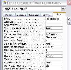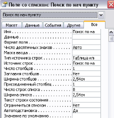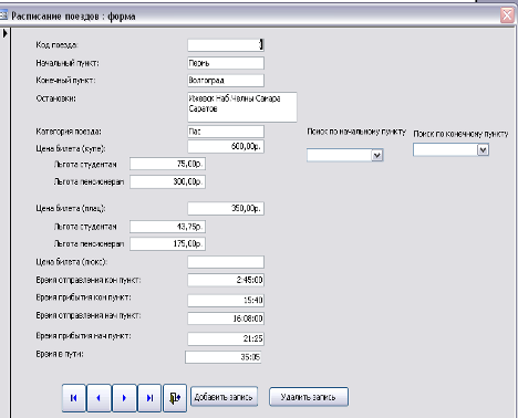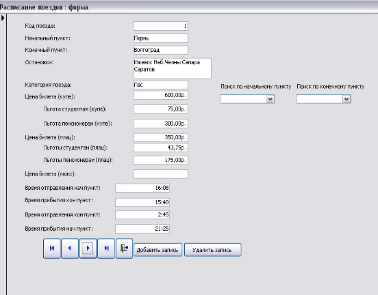 Рис. 12. Внешний вид готовой формы Для этого создадим свободное поле со списком, его имя «Поиск по нач пункту». Предварительно следует создать запрос, содержащий поле Начальный пункт и указать его в качестве источника строк поля со списком (Поиск по нач пункту). Поле со списком назовем Поиск по нач пункту (Рис. 13). Аналогично создадим поле со списком «Поиск по кон пункту» (Рис. 14).