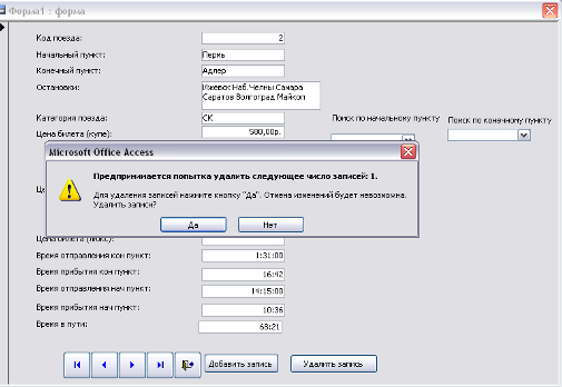 Рис. 18 нажимаем на панели инструментов кнопку Удалить запись (можно также на клавиатуре нажать клавишу Delete). Просмотреть данные можно с помощью запросов. Например, запрос – Все данные, чтобы его открыть нужно в окне «Расписание поездов: база данных» справа в Объектах выбрать Запросы. Появятся четыре запроса: Все данные, поиск по кон пункту, поиск по нач пункту, поиск по начальному и конечному пункту, выбираем запрос Все данные и открываем его. Здесь же можно изменить данные, удалить или добавить расписание нового поезда, но для удобства это лучше делать в таблицах (об этом рассказано выше). Рассмотрим формы. Для открытия форм. Выбираем в окне «Расписание