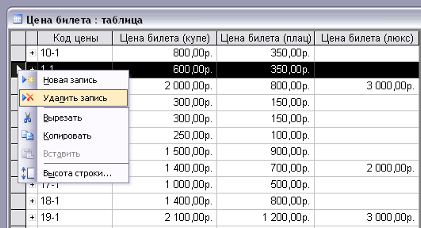 Рис. 17 Существует еще один способ удаления. Заходим в таблицу или запрос ставим курсор на строку, которую необходимо удалить нажимаем правой кнопкой мыши и из списка команд выбираем удалить запись (Рис. 18) или