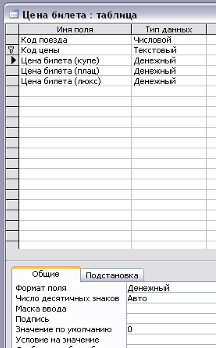 Рис. 2 3. Создадим таблицу Цена билета. В ней будут хранится данные: цена билета (купе), цена билета (плац), цена билета (люкс). Все поля кроме поля код цены и код поезда, будут иметь тип данных: денежный (Рис. 3).