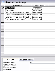 Рис. 3 4. Создадим таблицу Льготы. Здесь будет информация о льготах для студентов и пенсионеров на билеты для различных видов вагонов, все поля кроме код льгот и код цены будут иметь тип данных: денежный (Рис. 4).