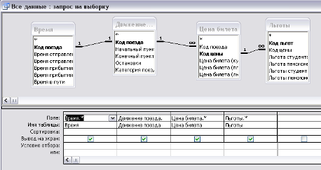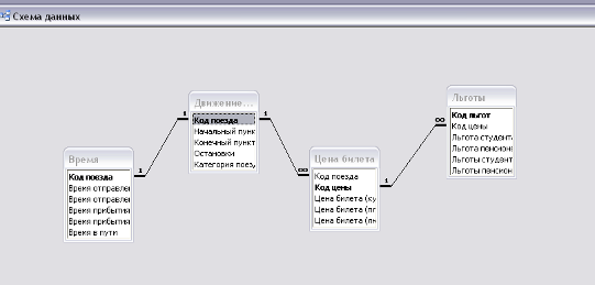Рис. 4 5. После распределения данных по таблицам и определения ключевых полей создаем схему данных для связи данных в разных таблицах. Для этого определяем связи между таблицами. Добавляем таблицы в Схему данных, связываем таблицы Движение поезда и время, по полю код поезда, для этого просто нажимаем в таблице Время поле Код поезда и, не отпуская мышки, тянем в таблицу Движение поезда к соответствующему полю Код поезда. В появившемся запросе связи отметим пункты: обеспечение целостности данных, каскадное обновление связанных полей, каскадное удаление связанных полей. После этого у нас появится связь один-к-одному. Так же свяжем таблицы Движение поезда и Цена билета по полю код поезда. В появившемся запросе связи отметим пункты: обеспечение целостности данных, каскадное обновление связанных полей, каскадное удаление связанных полей. После этого у нас появится связь один-ко-многим. Свяжем таблицу Цена билета и Льготы по полю код цены, связь будет один-ко-многим (Рис. 5.)