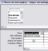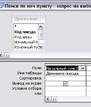 Рис. 6 база данные поезд расписание Создадим еще два запроса: Поиск по нач пункту и Поиск по кон пункту (Рис.7 а,б).