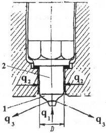Поэтому, во избежание отмеченных явлений, ряд фирм обладающих технологическими возможностями, применят скругление кромок отверстий, чем существенно продлевают их ресурс (см. рис 6.4.5). В мало- и среднеоборотных двигателях в целях удешевления изготовления и замены сопловых наконечников при их износе сопла изготавливают отдельно от основного корпуса распылителя. 6.4.3 Тепловое состояние и охлаждение форсунок В общем случае, количество подводимого к распылителю форсунки тепла определяется температурой газов t газ в камере сгорания и величиной площади их соприкосновения с распылителем Fр: q1 + q2 – q3 = Fp агаз (tгаз – tрасп), q1 и q2 - количества тепла, передаваемые распылителю через его торцевую 1 и цилиндрическую 2 поверхности (рис. 9-7), q3 - количество тепла, отводимое с впрыскиваемым топливом, Fp - площадь распылителя, соприкасающаяся с газами. С увеличением Fp количество передаваемого в распылитель тепла растет. агаз – коэффициент теплоотдачи от газов, tгаз – средняя заменяющая температура газов и tр температура стенок соплового наконечника.