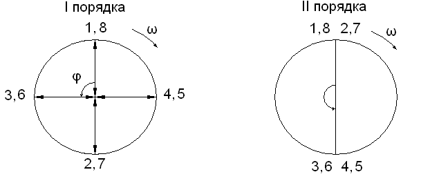 5. Частота вращения ротора турбокомпрессора на расчетном режиме nТ= В системе одноступенчатого изобарного наддува 8-цилиндрового двигателя типа MAN B&W L21/31 необходимо иметь один турбокомпрессор типа TK 35. V. Анализ уравновешенности двигателя Исходные данные Тип двигателя: четырёхтакный (m = 2) MAN L21/31; Число цилиндров: i = 8; Порядок работы цилиндров: 1-3-2-4-8-6-7-5 Порядок выполнения расчётов: 1) Определение угла заклинки звезды I порядка: