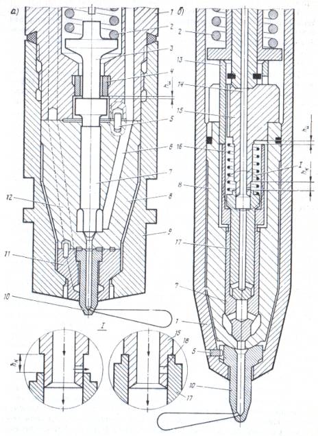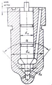 Высота подъёма игла форсунки ограничивается упором в зависимости от размеров форсунки и количества пропускаемого ею топлива находится в пределах 0,5-1,5 мм. С увеличением хода иглы растут динамические силы её удара о седло и упор, что приводит к появлению наклёпа и потери плотности посадки иглы. Посадочный конус иглы обычно принимается равным 60°. Посадочный конус седла в целях достижения узкой притирочной поверхности посадки, при которой достигается наиболее высокая плотность, принимается не менее на 2° меньше. Игла и её направляющее отверстие в распылителе являются прецизионными и изготовлены с высокой точностью. Путём селективного подбора выбирают пару «игла-направляющая» такой, чтобы зазор между ними укладывался в заданный технологический допуск, величина которого зависит от размеров, теплового режима работы, вязкости используемого топлива и находится в пределах 5-12 микрон. Скомплектованная таким образом пара является «неразлучной» и при эксплуатации из замена должна производится только парами, перекомплектации. По типу запорных органов и распыливающих отверстий применяются следующие виды распылителей: - клапанные многодырчатые (рис. 6.4.2) – получили наибольшее распространение в основном в двигателях с непосредственным впрыском, количество отверстий – Рис. 6.4.2 от 1 до 9, диаметр 0,20-1,5 мм. - клапанные однодырчатые (рис. 6.4.3,а) – применяются в предкамерных двигателях, для которых наилучшей формой распыливания является сосредоточенный факел с малым углом конуса и с большой пробивной способностью. - штифтовые, имеющие одно сопловое отверстие – применяются в сравнительно маломощных дизелях с раздельными камерами сгорания. Штифтовой распылитель с цилиндрическим штифтом (рис. 6.4.3, б) имеет постоянное сечение истечения и образует сосредоточенный факел с малым углом конуса. У штифтового распылителя (рис. 6.4.3, в) штифт выполнен в виде двух усечённых конусов, сложенных меньшими основаниями. Штифты выполняются с различными углами при вершине нижнего конуса (от 0 до 50°), благодаря этому в процессе движения штифта угол конуса распыливаемого факела изменяется в широких пределах, захватываю всё большее пространство камеры сгорания.