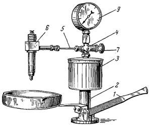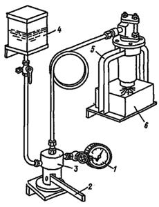 Герметичность цилиндрической уплотняющей поверхности и плотность посадки иглы проверяют на прессе, схема которого приведена на рис. 6.4.6.. Топливо из бака 4 поступает к одноплунжерному насосу 3, приводимому в действие рукояткой 2. Форсунка укреплена в штативе 5. Впрыск топлива осуществляется в бак 6. Давление, развиваемое насосом, контролируется манометром 1. Испытание плотности пары игла – направляющая подобно испытанию плунжерной пары. Но иглу следует нагрузить затяжной пружиной несколько больше, чтобы р1 превысило рекомендуемое давление впрыска для этого типа форсунки на 10-15 МПа. При перепаде давлений Δр = p1 ÷ p2 (2-5 МПа) нормальная плотность пары, т. е. время падения давления, соответствует 7-30 с. Плотность комплекта форсунок для дизеля указывают в правилах технической эксплуатации. Разница в Рис. 6.4.6. показателе плотности не должна превышать ± 25 % его средней величины. Испытания форсунки в сборе на прессе позволяют визуально оценить качество распыливания и плотность посадки иглы. Форсунку закрепляют в штативе, присоединяют трубку и прокачиванием удаляют воздух. Далее, прокачивая форсунку и регулируя натяжение пружины, устанавливают рекомендуемое давление распыливания. Перед контрольным впрыском тщательно обтирают кончик сопла. Затем медленно нажимают на рукоятку пресса, наблюдая за манометром и за кончиком сопла: сопло должно быть сухим до момента подъема иглы, при котором манометр покажет давление распыливания. После впрыска вновь вытирают кончик сопла: в посследующий момент, если игла садится плотно, сопло должно быть сухим. При обнаружении подтекания иглу в первую очередь необходимо промыть, а затем, если подтекание продолжается, притереть к уплотняющей поверхности. 6.4.5. б). Проверка и регулировка топливной форсунки Проверять работу форсунки можно при помощи топливного насоса, установленного на двигателе; или лучше на специальном стенде (Рис. 6.4.7.). Передвигая рычаг 1, действуют на плунжер насоса 2. Последний забирает топливо из бака 3 и, прокачивая его через тройник 4 и трубопровод 5, подает в форсунку 6. Перед проверкой открывают кран 7 и, передвигая рычаг, удаляют воздух из системы.