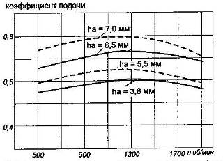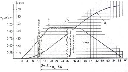Нахождение высоты открытия клапанов: dгорл = 180 мм dштока = 28 мм S1 = πd2горл / 4 - πd2штока / 4 = 24815 S2 = πDh = 3.14×180×h S1 = S2 h = S2 / πD = 24815 / (3.14×180) = 56,7 Диаграмма линейного открытия клапанов, определяемого профилем кулачков газораспределенного привода 2.Определим потерю при прохождении воздуха во время продувки. Расход воздуха через компрессор: а) Gк = б) Gк =