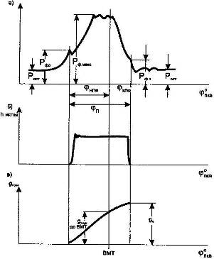 Рис. 6.7.2. Кривые: а). давление впрыска у форсунки, б). хода иглы форсунки, в). законы подачи топлива в пределах цикла. В общем случае процесс топливоподачи в системе «ТНВД - форсуночный топливопровод – форсунка» можно условно подразделить на следующие этапы: 1 этап – наполнение полости ТНВД топливом, поступающим от подкачивающего насоса под давлением 0,4-0,5 МПа. Начало - открытие плунжером при его движении вниз впускного окна (клапана). Окончание - закрытие плунжером впускного окна (клапана) при его движении из крайнего нижнего положения вверх (геометрическое окончание наполнения). Действительное окончание наполнения происходит раньше, так как при подходе верхней кромки плунжера к верхней кромке окна благодаря возникающему в остающейся узкой щели дросселированию начинается сжатие топлива, давление топлива начинает расти и перепуск прекращается. При этом, чем больше обороты двигателя, тем больше сказывается дросселирование и тем раньше (по углу поворота вала) заканчивается наполнение и начинается сжатие топлива. Таким образом, активный ход плунжера несколько увеличивается. 2 этап – сжатие топлива в надплунжерной полости насоса от давления подкачки до давления, при котором открывается нагнетательный клапан насоса Pоткр.н.кл. = Pзатяга.пруж.кл. + Pост.. Здесь уместно отметить, что существенную роль в процессе топливоподачи играет сжимаемость топлива. Коэффициент сжимаемости топлив а = (0,6 - 1,0) 10-6 мЗ/кг. Благодаря сжимаемости плунжер затрачивает часть своего хода на сжатие топлива Расчетное уравнение – Fпл Спл dt = a V1 dp (1) где: Fпл – площадь плунжера, Спл – скорость плунжера, t - время, V1 – объем надплунжерной полости насоса, Р - давление топлива. 3 этап – продолжение сжатия (соответствующего роста давления) топлива в объеме полости насоса V1 и в объеме топливопровода и форсунки V2. Начало – открытие нагнетательного клапана. Окончание – достижение давления открытия иглы Рфо. Расчетное уравнение – Fпл Спл dt = a (V1 + V1) dp (2) 4 этап – впрыск топлива в цилиндр с момента открытия иглы и до момента начала отсечки в ТНВД. Начало этапа - момент подъема давления топлива у иглы форсунки до величины давления открытия иглы. Окончание - начало отсечки в ТНВД, соответствующее открытию отсечной кромкой плунжера отсечного отверстия (открытию отсечного клапана в насосе клап. типа) и закрытие нагнетательного клапана. Расчётное уравнение – Fпл Спл dt = a (V1 + V2) dp + μ fc (2/ρ)1/2 (Pт – Pц.ср)1/2 dt (3) Объёмная подача Объём сжимаемого Расход топлива плунжера топлива через форсунку где: μ - коэффициент истечения сопловых отверстий, fc - суммарное сечение сопловых отверстий, ρ - плотность топлива, Рт - давление топлива в период впрыска, Pц.ср. - среднее давление в камере сгорания в период впрыска. 5 этап - продолжение истечения (впрыска) топлива из форсунки от момента отсечки в насосе и посадки нагнетательного клапана на седло до момента, когда давление у форсунки упадет до давления посадки иглы на седло (закрытие иглы). Впрыск происходит за счет расширения топлива, оставшегося в топливопроводе и форсунке (в объеме V2). Расчётное уравнение – a V2 dp = - μ fc (2 (Pт – Pц.ср) / ρ)1/2 dt (4) При наличии у нагнетательного клапана разгрузочного пояска давление в топливопроводе и форсунке резко падает до Рост ≤ Рзакр. иглы и тогда последняя фаза впрыска практически отсутствует. Это хорошо, так как истечение то