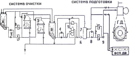 3) Строим звезду Iго и IIго порядка (схемы кривошипа) Вывод: Двигатель уравновешен по всем силам инерции вращающихся масс (ΣPjВ = 0), поступательно – движущихся масс Iго и IIго порядка (ΣPjI = 0, ΣPjII = 0), по всем моментам инерции поступательно – движущихся масс Iго и IIго порядка (ΣMjI = 0, ΣMjII = 0) и по моментам инерции вращающихся масс (ΣMjВ = 0) VI. Узловой вопрос “Топливная аппаратура Судовых ДВС” Типовая схема топливной системы судовой дизельной установки, включающей топливоподготовку и подачу топлива к двигателю, представлена на рис. 6-1. До использования в двигателе топливо должно быть очищено от механических примесей и воды (отстаивание, сепарирование, фильтрация) и подготовлено к подаче (повышение давления для улучшения наполнения ТНВД и подогрев вязкости до 10-12 сСт).