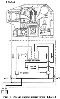 Шатун стальной, кованный, круглого сечения с нижней головой морского типа. Наличие морской головки позволило увеличит диаметр мотылевой шейки и этим существенно снизить удельные давления в подшипнике. Это же позволяет не прибегая к разборке подшипника вынимать шатун совместно с поршнем и втулкой цилиндра. Вкладыши трёхслойные с приработанным покрытием. Новым является использование трёхслойной втулки головного подшипника взамен традиционно применявшейся втулки из свинцовистой бронзы. Канализация масла в шатуне традиционная. Топливовпрыскивающая аппаратура включает топливный насос золотникового типа с регулировкой по концу подачи и форсунку многодырчатую, неохлаждаемую. Топливные трубки высокого давления одеты в защитный кожух, исключающий проникновение протечек топлива за пределы кожуха. Протечки могут возникать как при ослаблении штуцерных соединений форсуночной трубки, так и при её разрыве, что особенно опасно, так как струи топлива и образующийся туман из частиц топлива могут попасть на горячие детали и воспламенится. К сожалению, подобные случаи пожаров бывали неоднократно. Регулятор гидромеханический или электронный с гидравлическим сервомотором. Клапаны изготовлены из термо- и коррозионно-стойкой стали, на тарелках и сёдлах имеется наплавка. Для предотвращения образования отложений на рабочих поверхностях предусмотрен механизм проворачивания клапанов. Система турбонаддува постоянного давления с промежуточным двухступенчатым воздухоохладителем трубчатого типа. Охлаждающая вода высокотемпературного контура проходит через первую ступень, а вода низкотемпературного контура поступает во вторую ступень. Наличие двух ступеней позволяет обеспечивать охлаждение воздуха при работе двигателя на высоких нагрузках и нагревать воздух при переходе на малых нагрузках. Система воздухоснабжения двигателя в целях ускорения реакции ГТК на изменение режима работы двигателя включен Лямбда-Регулятор. Схема системы охлаждения двигателя представлена на рис. 2.