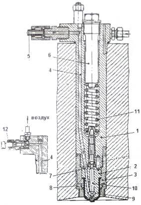Форсунки служат для непосредственного впрыскивания топлива в цилиндр двигателя, распыливания его на частицы с размером не более 5-30 мк и распределения их внутри камеры сгорания. Представленная на рис. 6.4.1. форсунка размещается в крышке цилиндра и состоит из двух основных элементов – корпуса 1 и распылителя 2, прижимаемого к корпусу накидной гайкой 3. Топливо от насоса подводится через штуцер 5 к каналу 4, откуда попадает в концевую выточку 10 на торце распылителя и по трём каналам 8 подаётся в полость 9 распылителя. Клапан 12 служит для выпуска воздуха. Игла 10 распылителя через болт 6 нагружена пружиной 11, затяг которой может регулироваться болтом 6. Изменением силы затяга регулируется давление отрыва иглы от седла (начальное давление впрыска – Pфо). При закрытом положении игла своим конусом сидит на конусе сопла и препятствует Рис. 6.4.1. проникновению топлива в ниже расположенную камеру сопловых отверстий. Положение иглы определяется действием двух сил: силы затяга пружины Pпр, прижимающей иглу к седлу, и силы давления топлива Pф, действующей на дифференциальную площадку