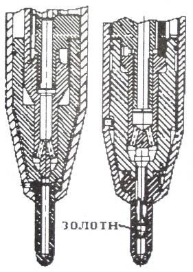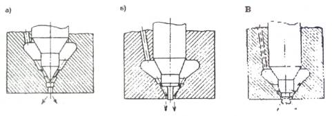 С увеличением диаметров сопловых отверстий, а это в эксплуатации происходит в следствии их эрозионного изнашивания, падает давление распыливание и увеличивается число и размер крупных частиц. Поэтому все ведущие фирмы требуют периодически проверять диаметр отверстий и не допускают дальнейшей эксплуатации распылителей, в которых диаметр отверстий превышает номинал на 10 и более процентов. Исследования, проведённый фирмой МАН на двигателях MC, показали, что объём внутренней полости соплового наконечника играет существенную роль в образовании в цилиндрах сажистых частиц и углеводородов (CH), а так же коксований сопловых отверстии. Уменьшение этой полости на 15% достигнутое путём введения в канал сопла золотника, изготовленного за одно целое с иглой (см. рис. 6.4.4). Позволило существенно повысить чистоту выхлопа. Рис. 6.4.4К уменьшению объёма камеры сопла сегодня прибегают и при производстве форсунок среднеоборотных двигателей. В большинстве случаем отверстия в распылителях сверлятся. На выходе сверла образуются заусеницы, провоцирующие образование вихрей, приводящие к кавитационно-эрозийным разрушениям и быстрому износу отверстий.
