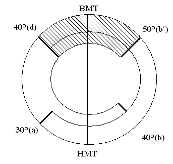 По результатам расчета строим расчетную диаграмму (рис. 2) Масштаб давления: mp = 0,11 МПа/мм. Масштаб объема: mv = 0,0072 м3/мм. Среднее индикаторное давление: Площадь диаграммы теоретического цикла (до скругления): Sтеор=3844 мм2. Площадь диаграммы теоретического цикла (после скругления): Sд=3763 мм2. Коэффициент скругления : j ск = Среднее индикаторное давление теоретического цикла (Pi`), МПа: Pi′ = = Расчетное среднее индикаторное давление, МПа: Pi = P’i · jск = 2,769 · 0,975 = 2,711. Заданное среднее индикаторное давление, МПа: Piзад = Среднее индикаторное давление из диаграммы, МПа: Piд = Погрешность расчета, %: DPiзад = (допуск ± 2,5%). Погрешность построения, %: DPiд = (допуск ± 5,0%). Индикаторные и эффективные показатели: Индикаторная работа газов в цилиндре, кДж: Li = Pi · Vh· 103 = 2,711 · 0,0107 · 103 = 29,01. Среднее эффективное давление, МПа: Pe = Pi · hм = 2,711 · 0,93 = 2,52. Индикаторная мощность, кВт: Ni = Эффективная мощность, кВт: Ne = Ni · hм = 1740,6 · 0,93 = 1618,8. Часовой расход топлива, кг/ч: Gч = Удельный индикаторный расход топлива, кг/кВт∙ч: gi = Удельный эффективный расход топлива, кг/кВт∙ч: g e = Индикаторный КПД: h i = Эффективный КПД: hе = hi · hм = 0,511 · 0,93 = 0,475 Погрешность расчета (допустимое отклонение ± 2,5 %): DPe = Dge = DNe = III. Расчет процесса газообмена 1. Построение круговой диаграммы фаз газораспределения