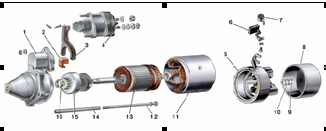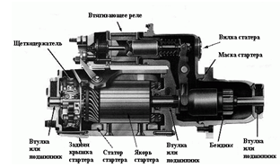 Рисунок 1.1 - Устройство стартера автомобиля (схема устройства) Основные части стартера: - втягивающее реле стартера; - щеткодержатель (держатель щеток) стартера; - вилка стартера; - маска стартера; - втулка стартера; - подшипник стартера; - задняя крышка стартера; - статор стартера; - якорь стартера; - бендикс стартера. 1.3 Принцип работы стартера Принцип работы стартера заключается в следующем: при замыкании контактов замка зажигания по втягивающей обмотке тягового реле протекает ток, плунжер электромагнита втягивается и включается удерживающая обмотка электромагнита, плунжер (сердечник) электромагнита и соединенный с ним рычаг (вилка) перемещает шестерню бендикса. Одновременно плунжер (сердечник) давит на пластину, которая в момент ввода шестерни в зацепление с венцом маховика замыкает контакты. Ток через замкнутые контакты поступает в обмотку электродвигателя, и якорь начинает вращаться. После запуска двигателя водитель с помощью замка зажигания разрывает цепь обмотки электромагнита, под действием пружины размыкаются контакты электромагнита, и шестерня бендикса возвращается в исходное положение. 1.4 Материалы, применяемые при изготовлении, техническом обслуживании и ремонте стартера. Эксплуатационные материалы Используемые эксплуатационные материалы – это моторное масло.Перед сборкой необходимо смазать подшипники, цапфы и шлицевую часть вала. Диагностика стартеров проводится с помощью прибора Э-214, на стендах типа532М, Э-211, 532-2М. После установки и крепления стартера в специальном захвате стенда производят проверку в режиме холостого хода - включают стартер, дают ему поработать 30 с и производят замер силы тока по амперметру) и частоту вращения якоря (переносным тахометром). Если после проверки получены положительные результаты, стартер проверяют в режиме полного торможения, для этого на стенде Э-211 устанавливают специальное приспособление с динамометром. Для проверки работоспособности тягового реле стартера в цепь питания обмотки тягового реле вводят вольтметр или амперметр, устанавливают между ограничительным кольцом и шестерней привода прокладку толщиной от 12,8 до 15,0 мм. Корпус стартера выполняют из конструкционной магнитной стали (обычно свернутой из листа — сварной)[8]. 2. Техническое обслуживание стартера 2.1 Значение и сущность технического обслуживания автомобилей У нас в стране принята планово-предупредительная система технического обслуживания и ремонта автомобилей. Сущность этой системы состоит в том, что техническое обслуживание осуществляется по плану, а ремонт – по потребности. Принципиальные основы планово-предупредительной системы технического обслуживания и ремонта автомобилей установлены действующим Положением о техническом обслуживании и ремонте подвижного состава автомобильного транспорта. Техническое обслуживание включает следующие виды работ: уборочно-моечные, контрольно-диагностические, крепежные, смазочные, заправочные, регулировочные, электротехническое и другие работы, выполняемые, как правило, без разборки агрегатов и снятия с автомобиля отдельных узлов и механизмов. Если при техническом обслуживании нельзя убедиться в полной исправности отдельных узлов, то их следует снимать с автомобиля для контроля на специальных стендах и приборах. Техническое обслуживание: установл