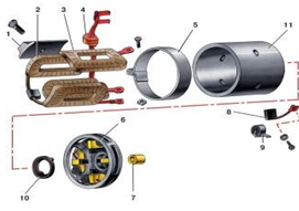 Рисунок 3.1 - Детали стартера 35.3708 1 — крышка стартера со стороны привода с промежуточным кольцом; 2 — резиновая заглушка; 3 — рычаг привода; 4 — тяговое реле; 5 — крышка со стороны коллектора; 6 — щетка; 7 — пружина щетки; 8 — защитный кожух; 9 — стопорная шайба; 10 — регулировочная шайба; 11 — корпус; 12 — стяжной болт; 13 — якорь; 14 — изолирующая трубка; 15 — обгонная муфта с шестерней привода; 16 — ограничительное кольцо Особенности разборки стартера СТ-221 связаны с другой конструкцией коллектора и задней крышки.