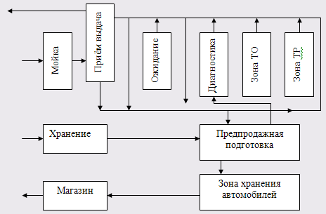 3. ОРГАНИЗАЦИОННАЯ ЧАСТЬ 3.1 Выбор метода организации производства ТО и ремонта на СТО Специализированная станция технического обслуживания выполняет определенный законченный комплекс работ по обслуживанию или ремонту автомобилей. Развитие СТО позволяет концентрировать материально - технические средства и создает предпосылки для внедрения новой техники, прогрессивной технологии и рациональной организации производства. Это влечет за собой значительное увеличение производительности труда и сокращения трудоемкости работ при повышении их качества. Принятый общий технологический процесс является основанием для правильного размещения на территории СТО всех основных вспомогательных служб. При разработке технологического процесса важно, чтобы маршруты движения автомобилей на территории СТО были прямоточными и не пересекались. Для нормального функционирования СТО важное значение имеет эффективная система управления производством. Диагностика в технологическом процессе выполняет функцию измерительного органа, регулируемым объектом является автомобиль, управляющим органом - технический отдел СТО, а исполнительный орган - зоны технического обслуживания и ремонта автомобилей. Капитальный ремонт агрегатов на СТО выполняются индивидуальным методам. ТО и ремонт выполняется на универсальных постах. При таком методе организации технологического процесса посты могут быть тупиковыми и проездными (при моечных работах). Принимаем тупиковый метод организации технического обслуживания на универсальных постах. Это позволит обслуживать на одном и том же посту автомобили разных марок. Текущий ремонт проводится на постах TP и специализированных участках: агрегатно-механическом, ремонта аккумуляторных батарей, ремонта электрооборудования, ремонта топливной аппаратуры, обойном, кузовном и малярном. На постах TP выполняют разборочно-сборочные, регулировочные и крепежные работы, объем составляет около 40 % общего объема работ TP, а с учетом мелких работ, по ремонту кузова 50 %. Остальные работы текущего ремонта, а также работы по капитальному ремонту агрегатов проводятся на специализированных участках. Дефектные агрегаты, узлы и механизмы, снятые с автомобилей, направляют на соответствующие участки для проведения необходимых работ, после чего они поступают на участок текущего ремонта И устанавливаются на автомобиль. 3.2 Схема технологического процесса на СТО Функциональная схема СТО приведена на рисунке 1.