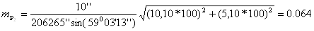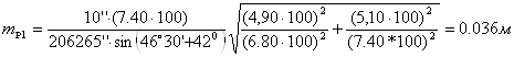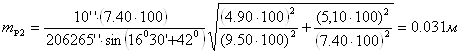 Расхождение координат, полученных при решении двух вариантов засечки, с учетом точности измерений допускается до 0,2 м. В моём случае расхождение по Х составило 0,1 м, и по Y - 0,1 м. расхождения находятся в допуске, следовательно, за окончательные значения координат принимаем средние значения двух вариантов. Среднее Х=5310,455 Среднее Y=3040,655 1.5 Оценка ожидаемой точности полученных результатов Я определила среднюю квадратическую ошибку положения точки для каждого варианта засечки по формуле: