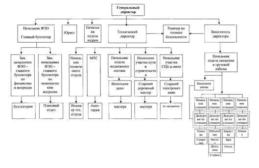 Отложенные налоговые активы и отложенные налоговые обязательства в балансе предприятия появились лишь в 2004 году, и связаны они с изменениями в "Налоговом Кодексе". 5. Информационные ресурсы играют немаловажную роль для данной компании. Т.к. при работе необходимо знать где можно приобрести более дешевые материалы, топливо и другую продукцию. Главная проблема, которая может возникнуть при использовании первого из перечисленных видов ресурсов, - это их нехватка или недостаточная квалификация. Решением проблемы в данном случае будет постоянная работа над обучением и повышением квалификации работников, привлечение в компанию новых целеустремленных сотрудников и проведение в целом разумной кадровой политики. 1.4 Структура организацииСтруктура организации является элементом ее внутренней среды. Структура организации представляет собой взаимоотношения уровней управления с функциональными областями организации для наиболее эффективного достижения целей. Данный элемент внутренней среды организации тесно связан с характерным для нее специфическим разделением труда и требованиями построения системы контроля в организации. Организационная структура предприятия ОАО "ИППЖТ" на рисунке - 1