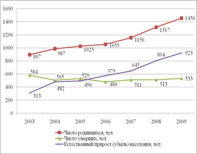В течение 2003-2009 гг. естественный прирост населения характеризовался положительной динамикой, обусловленной ростом числа родившихся при относительно постоянном уровне смертности, по которому отмечаются тенденции снижения к концу рассматриваемого периода (таблица 2, рис. 1). Таблица 2. Сведения о числе родившихся и умерших за период 2003-2009 гг., человек