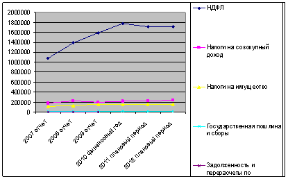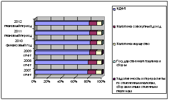 Рис. 13. Соотношение темпа роста поступлений НДФЛ в бюджет города Ханты-Мансийска и уровня инфляции в России. Таблица 17. Структура налоговых доходов бюджета города Ханты-Манcийска в 2007-2012 гг.