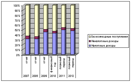 Рис. 10. Изменение структуры доходов бюджета города Ханты-Мансийска в отчетном периоде 2007 – 2009 и в бюджете на 2010 - 2012 гг.