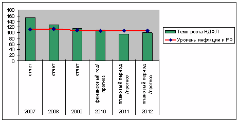 Рис. 12. Удельный вес основных видов налогов в общем объеме налоговых доходов бюджета города Ханты-Мансийска в период 2007 – 2012 гг. 586713 тыс. руб. прироста налоговых доходов за 2007-2009 гг. практически полностью было обеспечено за счет поступлений от НДФЛ – 507602 тыс. руб. и лишь 4% за счет совокупного налога и 8% вследствие увеличения сбора имущественных налогов. При этом увеличение поступлений от НДФЛ в 2007 – 2009 гг. происходило темпами выше отмеченного в стране уровня инфляции, что является положительным фактором. В 2011-2012 гг. в бюджете города консервативно запланировано снижение поступлений НДФЛ по сравнению с 2010 г. и существенно ниже уровня прогнозируемой инфляции, что отражает в Ханты-Мансийске стагнацию объема фонда оплаты труда (рисунок 13). При прогнозируемых в РФ 7 % инфляции в 2011-2012 гг.[10] поступления от НДФЛ в бюджет города запланированы в размере 96,3% на 2011 г. и 100,1% на 2012 г. по отношению к предшествующему году.
