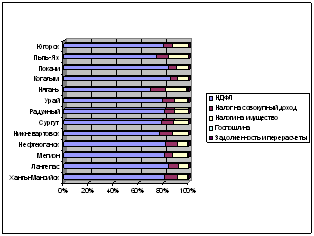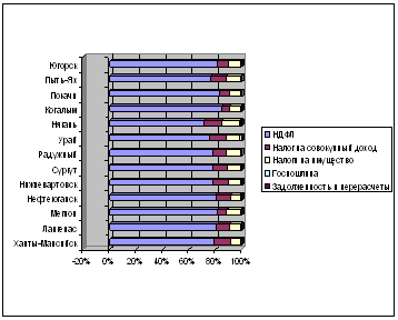 Рис. 14. Структура налоговых доходов бюджетов городских округов Ханты-Мансийского автономного округа в 2007 г. Высокой доле НДФЛ в бюджете Ханты-Мансийска и других городских округов способствовало выполнение Ханты-Мансийским автономным округом обязанности по передаче в местные бюджеты в соответствии с пунктом 3 статьи 58 Бюджетного кодекса Российской Федерации единых и (или) дополнительных нормативов отчислений от НДФЛ, исходя из зачисления в местные бюджеты не менее 10 процентов налоговых доходов консолидированного бюджета субъекта Российской Федерации. В округе в 2009 г. был Министерством финансов России был отмечен максимальный уровень дополнительных поступлений данного налога в местные бюджеты.