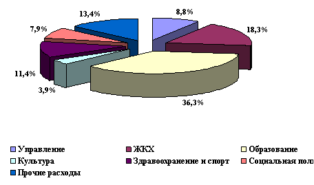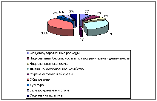 Рис. 17. Структура расходов местных бюджетов в РФ в 2009 г. В бюджете 2010-2012 гг. соотношение расходов по их удельному весу остается примерно в ранее сложившихся пропорциях: с наибольшей долей в сферах образования и жилищно-коммунального хозяйства и некоторым увеличением на общегосударственные расходы, на национальную экономику, на здравоохранение, социальную политику и снижение расходов на культуру. Увеличение расходов в бюджете 2010-2012 гг. запланировано, в том числе и за счет поступления межбюджетных трансфертов на реализацию программы «Формирование безбарьерной среды для инвалидов», целевое финансирование из бюджета автономного округа конкурса на самый благоустроенный город за 2009 г., на финансирование наказов избирателей депутатам Думы ХМАО-Югры, за счет субвенций на обеспечение жильем отдельных категорий граждан в соответствии с федеральным законодательством. Также увеличение расходов бюджета в 2010-2012 гг. произошло за счет планирования расходов бюджета на реализацию целевой программы «Электронный муниципалитет на 2010 -2012 гг.». На рисунке 17 представлена структура расходов местных бюджетов в Российской Федерации в 2009 году для сравнения с ней на рисунке 18 представлена структура расходов бюджета города Ханты-Мансийска в том же году.