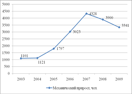 Рис. 1. Естественное движение населения Ханты-Мансийска в 2003-2009 гг., человек Основные показатели естественного движения населения в городе Ханты-Мансийске в сопоставлении с РФ и ХМАО-Югрой представлены в таблице 3 и 4. Ожидаемая продолжительность жизни при рождении в городе Ханты-Мансийске по итогам 2008 г. составила 58 лет. По предварительным оценкам, в 2009 г. данный показатель составил 60 лет. Для сравнения, средняя продолжительность жизни в Ханты-Мансийском автономном округе - Югре в 2008 г. составила 69,91 лет, а в Российской Федерации – 67,88 лет. Таким образом, тенденцию изменения во времени рассматриваемого показателя можно считать благоприятной, однако фактические значения ожидаемой продолжительности жизни в городе Ханты-Мансийке остаются не высокими. Очевидно, что для административного центра субъекта федерации данное обстоятельство является препятствием на пути к устойчивому развитию. Механический (миграционный) прирост в течение 2003-2009 гг. имел положительные значения (рис 2). С 2003 г. до 2007 г. сальдо миграции устойчиво росло. С 2007 г. до 2009 г. механический прирост снижался, однако темпы такого снижения к концу указанного периода ослабевают. Сложившаяся ситуация объясняется рядом социальных причин: · отсутствие свободного жилья; · большая очередь на устройство детей в детские дошкольные учреждения, · достаточно высокий уровень цен на продукты и товары повседневного спроса, тарифов на коммунальные услуги (одни из самых высоких в округе), · трудности в устройстве на работу с достойной оплатой труда (свыше 30 – 35,0 тыс. руб.); · сокращение объемов жилищного строительства. Численность временного населения за 2009 год составила 4596 человек или 63,4% к итогам 2008 года (7244 человек). До 2005 года основную численность временно зарегистрированных граждан составляли вахтовые и сезонные рабочие, привлекаемые строительными, торговыми и другими предприятиями города на земляные работы, работы по благоустройству и озеленению, по продаже товаров и приготовлению пищи. В 2006 – 2009 г.г. категорию «временных» горожан пополнили студенты очных отделений Югорского государственного университета и других профессиональных учебных заведений города, работники гостиничных комплексов и сервисных услуг (медицинских, туристических, услуг культуры и спорта). В последние годы финансовый кризис оказал серьёзное негативное влияние на количество временных рабочих в строительной отрасли, где упали объемы строительства. Как следствие – сократилась численность работников, снизилась заработная плата. Негативные изменения произошли и в геологоразведочной отрасли, где численность работников сократилась практически на 700 человек.