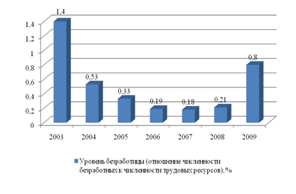 Количество индивидуальных предпринимателей в 2009 году увеличилось на 307 человек и составило 2421 человек, количество малых предприятий на 01.01.2010 составило 503 единицы, что на 26 единиц больше, чем в 2008 году. Во многом, рост числа субъектов малого предпринимательства в городе связан с мерами государственной и муниципальной финансовой и имущественной поддержки, осуществляемыми органами местного самоуправления города Ханты-Мансийска, и государственными субсидиями, привлекаемыми в рамках мероприятий государственной поддержки малого и среднего предпринимательства. В 2009 году Фондом поддержки предпринимательства Югры была оказана грантовая поддержка субъектам предпринимательства на создание собственного дела в реализации 9 проектов. Увеличилось финансирование мероприятий городской программы поддержки малого предпринимательства за счет субсидий окружного бюджета в рамках софинансирования муниципальных программ. С 2009 года осуществляется имущественная поддержка в части предоставления муниципального имущества в аренду на льготных основаниях. В связи с ростом числа малых предприятий, растет среднесписочная численность работников, занятых на этих предприятиях. В частности, доля среднесписочной численности работников малых предприятий в среднесписочной численности работников всех предприятий и организаций города в 2009 г. составила 10,9% по сравнению с 10,6 % в 2008 г. При этом почти 40 % новых рабочих в 2009 г. было создано в сфере малого бизнеса. В целом, занятость в секторе малого бизнеса в городе Ханты-Мансийске оказалась достаточно устойчива несмотря на действие мирового финансового кризиса. В частности, в 2006 г. доля малых предприятий в среднесписочной численности работников всех предприятий и организаций составляла около 10,7 %, что на 0,2 % меньше показателя в 2009 г. Вместе с тем, общая динамика изменений на рынке труда в последние несколько лет имела неоднородную картину. После плавного сокращения уровня безработицы в 2003 – 2007 гг. произошло резкое увеличение данного показателя в 2008 – 2009 гг. Это было связано с мировым финансовым кризисом. В 2009 году на предприятиях города сокращено 760 работников (в основном в отрасли геология). Таблица 8 Уровень безработицы