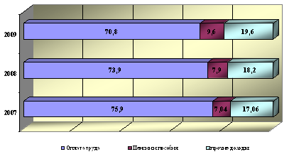 Рис. 4. Уровень безработицы в 2003 – 2009 гг. Численность безработных на 01.01.2010 года составила 431 человек и по сравнению с аналогичным периодом 2008 года возросла в 3,3 раза (на 01.01.2009 года – 130 человек). Уровень зарегистрированной безработицы в г. Ханты – Мансийке возрос с 0,21% в 2008 году до 0,8% в 2009 году. При этом в 2009 г. 92 работодателя города (2008 год – 208) сообщили о своей потребности в рабочей силе в количестве 1112 единиц (2008 год - 902 единицы), то есть нагрузка на одну заявленную вакансию составила 0,5 (2008 год - 0,2). 2.3.2 Уровень жизни населения, состояние социальной защиты населения. Социальная сфераУровень жизни и доходы населения Основным источником доходов населения города остаются заработная плата у работающих горожан, пенсии и пособия у пожилых и неработающих жителей, стипендии или пособия у студентов и детей. В 2009 году размер среднемесячной заработной платы составил 39797,5 руб., в 2008 году – 39399,7 руб., в 2007 году - 32398,9 руб. Обязательства Правительства Российской Федерации по индексации базовой и страховой части пенсий с учетом роста потребительских цен, а также выполнения задачи по доведению среднего размера социальной пенсии к концу 2009 года до уровня прожиточного минимума пенсионера были выполнены, поэтому среднемесячный размер пенсии одного среднестатистического пенсионера составил 11962,3 руб. или 157,9% к уровню 2008 года (7576,82 руб.) и 215,7% к итогам 2008 года (5546,3 руб.) Несмотря на меры по улучшению материального положения пенсионеров, коэффициент замещения (соотношение среднего размера пенсии и заработной платы) в 2009 году составил по России в целом 37,8%, по городу - 32,8%. Среднемесячный размер стипендии одного студента, обучающегося на бюджетной основе, на начало 2009/2010 учебного года составил 1997,2 руб. или 101,2% к итогам 2008/2009 учебного года (1973,5 руб.) и 159,2 % к итогам 2007/2008 учебного года (1254,8 руб.). Среднемесячный размер детского пособия в расчете на одного получателя в 2009 году составил 2359,6 руб. или 142,8% к итогам 2008 года (1652,42 руб.) и 83,9 % к аналогичному периоду 2007 года (2811,41руб.). Снижение размера пособия объясняется тем, что количество получателей с более низким размером пособия возросло, а количество получателей более высокого размера пособия снизилось. Номинальный среднемесячный доход на 1 жителя города в 2009 году по сравнению с 2008 г. практически не изменился и составил 30737,6 руб. (100,5% к итогам 2008 г.). Однако из-за повышения цен и тарифов на товары и услуги и роста числа безработных в 2009 г. произошло снижение реальных доходов населения на 10,6% по сравнению с 2008 г. Это отразится на увеличении в ближайшем будущем доли населения с доходами ниже прожиточного минимума. В общей сумме денежных доходов населения наибольшую долю составляет заработная плата - 70,8 % (2008 год - 73,9%, 2007 год – 75,9%), доля пенсий и пособий – 9,6% (2008 год -7,9%, 2007 год – 7,04%), прочие доходы – 19,6% (2008 год – 18,2%, 2007 год - 17,06 %: стипендии, материальная помощь, доходы от продажи иностранной валюты и недвижимости, проценты на банковские сбережения, ссуды и кредиты банков, переводы полученные и отосланные и т.д.).