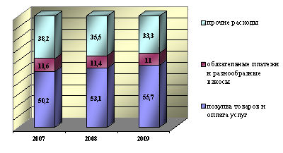 Рис. 5. Структура доходов населения в 2007 – 2009 гг., % Величина прожиточного минимума в среднем на душу населения и по отдельным категориям населения в месяц за III квартал в 2007 – 2009 г.г., утвержденная Правительством ХМАО – Югры составляла: · в среднем на душу населения – 8109 руб. (2008 год – 7213 руб.; 2007 год – 6111 руб.); · на одного трудоспособного – 8696 руб. (2008 год – 7705 руб.; 2007 год – 6532 руб.); · на одного пенсионера – 6583 руб. (2008 год – 5841 руб.; 2007 год – 4930 руб.); · на одного ребенка – 7457 руб. (2008 год – 6654 руб.; 2007 год – 5581 руб.). Если в 2008 году численность населения с денежными доходами ниже величины прожиточного минимума составляла по городу 3,6%, то в 2009 году – 2,5%. Наибольшую долю денежных расходов населения составляют расходы на приобретение товаров и оплату услуг (от 50,2% в 2007 году, до 53,1% в 2008 году и до 55,7% в 2009 году), доля обязательных платежей и разнообразных взносов сократилась с 11,6% в 2007 году до 11,0% в 2009 году. Доля прочих расходов (приобретение недвижимости и иностранной валюты, сбережения во вкладах, проценты за банковские кредиты, переводы отправленные и др.) – с 38,2% в 2007 году сократилась до 33,3% в 2009 году. Одна из причин – относительно невысокий рост заработной платы у достаточно большой численности работников массовых профессий (техслужащие, работники сферы общественного питания и розничной торговли, кассиры, няни, сторожа и т.д.), необходимость горожан не копить деньги на «черный день», а вкладывать средства в приобретение товаров длительного пользования высокого качества, оплату жилищно-коммунальных услуг, услуг транспорта, в сфере образования, связи, бытового обслуживания и прочих.