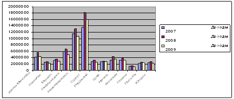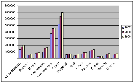 Рис. 8. Доходы бюджетов городских округов Ханты-Мансийского автономного округа в 2007-2009 гг.