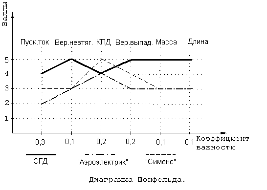 Современное производство искусственных волокон нельзя представить без высокоэкономичного и высокотехнологичного оборудования, поскольку существующее положение в отечественной экономике ставит перед производителями задачу максимального снижения затрат на выпуск продукции. Использование в машинах по производству химических волокон данного двигателя позволит снизить не только накладные затраты, но и снизить переменные затраты в части расхода электроэнергии за счет полного согласования режимов работы источника питания с электродвигателем, что в конечном счете приведет к увеличению конкурентоспособности выпускаемой продукции. Анализ технического совершенства разработки. Чтобы определить уровень технического совершенства СГД проведем сравнение его технико-экономических показателей с показателями аналогичных двигателей выпускаемых фирмами-конкурентами. В качестве аналогов выберем СДПМ (синхронные двигатели с постоянными магнитами) фирм «Аэроэлектрик» и «Сименс», которые мы будем сравнивать с СГД по бально-индексному методу и методу Шонфельда. При этом будем пользоваться следующими показателями уровня технического совершенства: - Пусковой ток; - Осевая длина; - Масса; - КПД; - Вероятность невтягивания в синхронизм; - Вероятность выпадения из синхронизма; Сравнение по бально-индексному методу Факторы конкурентоспособности оцениваются 10-бальной шкале экспертным методом. Для каждого фактора назначается коэффициент важности.