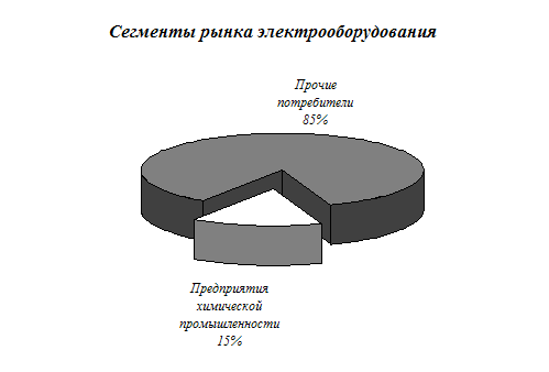 4. Описание рынка и его сегментов. Маркетинговые исследования показали, что рынок электрооборудования состоит из различных сегментов. Специфика выпускаемой нами продукции (СГД) состоит в том, что эти двигатели лучше всего использовать при работе с высокоинерционной нагрузкой. Это становится возможным благодаря уникальным свойствам механической характеристики двигателя. Работа с высокоинерционной нагрузкой наиболее характерна для предприятий химической промышленности, которые составляют 15 % от общей емкости рынка.