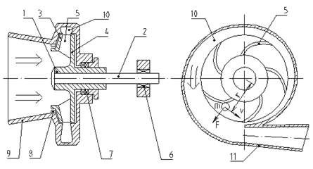 Под действием этой силы жидкость выбрасывается из рабочего колеса, в результате чего в центре колеса создается разряжение, а в периферийной его части - повышенное давление. Для обеспечения непрерывного движения жидкости через насос необходимо обеспечить подвод перекачиваемой жидкости к рабочему колесу и отвод от него. Жидкость поступает через отверстие в переднем диске рабочего колеса по всасывающему трубопроводу (подводу 9). Движение жидкости по всасывающему трубопроводу происходит вследствие разности давлений над свободной поверхностью жидкости в приемном бассейне (атмосферное) и в центральной области колеса (разряжение). Для отвода жидкости в корпусе насоса имеется расширяющаяся спиральная камера (в форме улитки), куда поступает жидкость, выбрасываемая из рабочего колеса. Спиральная камера (отвод 10) переходит в короткий диффузор, образующий напорный патрубок 11, соединяемый обычно с напорным трубопроводом. Схема центробежного насоса.