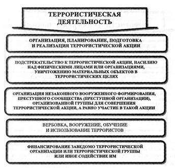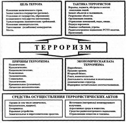 Преступления террористического характера - преступления, предусмотренные соответствующими статьями Уголовного кодекса Российской Федерации. К преступлениям террористического характера могут быть отнесены и другие преступления, предусмотренные Уголовным кодексом Российской Федерации, если они совершены в террористических целях. Террорист - лицо, участвующее в осуществлении террористической деятельности в любой форме. Террористическая группа - группа лиц, объединившихся в целях осуществления террористической деятельности или признающая возможность использования в своей деятельности терроризма. Организация признается террористической, если хотя бы одно из ее структурных подразделений осуществляет террористическую деятельность с ведома хотя бы одного из руководящих органов данной организации. Борьба с терроризмом - деятельность по предупреждению, выявлению, пресечению, минимизации последствий террористической деятельности. Контртеррористическая операция специальные мероприятия, направленные на пресечение террористической акции, обеспечение безопасности физических лиц, обезвреживание террористов, а также на минимизацию последствий террористической акции. Зона проведения контртеррористической операции - отдельные участки местности или акватории, транспортное средство, здание, строение, сооружение, помещение и прилегающие к ним территории или акватории, в пределах которых проводится указанная операция. Заложник - физическое лицо, захваченное и (или) удерживаемое в целях понуждения государства, организации или отдельных лиц совершать какое-либо действие или воздержаться от совершения какого-либо действия как условия освобождения удерживаемого лица. Цели борьбы с терроризмом Борьба с терроризмом в Российской Федерации осуществляется в целях: защиты личности, общества и государства от терроризма; предупреждения, выявления, пресечения террористической деятельности и минимизации ее последствий; выявления и устранения причин и условий, способствующих осуществлению террористической деятельности. Идеология терроризма - продемонстрировать устрашение, привлечь внимание к себе, заручиться поддержкой масс. Люди, обычно, предсказуемы (имеют свои привычки, благоразумны) и этим уязвимы для террориста. Террористы понимают поведение масс лучше, чем обычные люди. Многие возможности террористов порой недооцениваются правоохранительными органами. Тактика терроризма. Вербуются террористы из малоимущих слоев населения, у которых погибли родственники, нет средств существования, нет цели в жизни. Став членом группировки, они получают деньги, обретают уверенность и силу духа, появляется цель в жизни. Террористы изучают опыт терактов, повторяя удачные операции, стараясь застичь людей врасплох, внезапно. Милосердие у террористов отсутствует. Если теракт у группировки удался, группировка берет на себя ответственность за его совершение. Если теракт провалился, группировка быстро меняет свое название и берет на себя ответственность под другим названием, чтобы запутать полицию при расследовании теракта. Руководители группировок, как правило, талантливые люди, вынашивающие далеко идущие преступные цели. Материально-техническая база и финансирование террористов: Базы и центры подготовки террористов в страна
