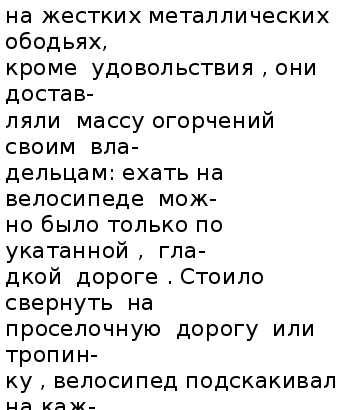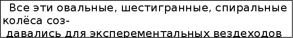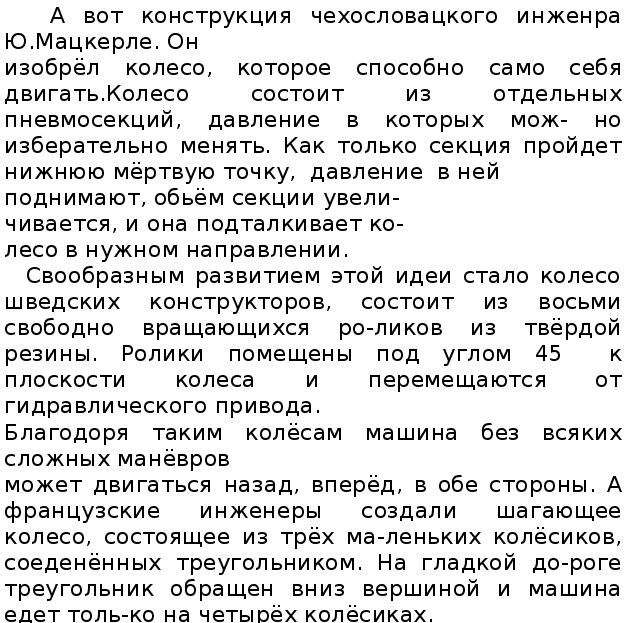 становилась всё тоньше, а концы оставались по-прежнему толстыми. Получалось нечто похожее на ось с двумя колесами. А когда люди заметили, что повозка на колёсах катится легче, чем на обычных катках, они стали нароч-но обжигать середину бревна. Так появились повозки на колё-сах. Подобные колёсные пары, называемые скатами, только не деревянные, а сталные - и сегодня применяются человеком - это поезда метро и вагоны железной дороги, паровозы,электровозы-все они ездят по рельсам на колёсах, скреплённых неподвижно с осью,- на скатах. Не только неуклюжие грузовые телеги, но и первые двухколёс-ные повозки, очевидно, ставились на сплошные, тяжелые, проч-ные колёса - скаты. Зато, как красиво - будьто не катятся по земле, а летят по воз-духу - выглядят боевые колесницы на больших, но легких колё-сах со спицами! Колесницам тоже очень много лет, и все же они появились позднее: сперва человек догадался сделать ось непод-вижной, а колеса вращающимися на оси; затем решил облегчить колесо - придумал спицы, обод и ступицу; ещё позднее - надел на обод для прочности железную шину. И на всё это человеку потребовалось несколько тысяч лет. Но эволюция колеса на этом не завершилась. В наши дни коле-со не только оснастилось пневматической шиной, но и обрело “колесо” в “колесе” - шарикоподшипник. Порою оно перестаёт быть круглым. Новую эру в создании колёс открыли космические исследова-ния. Луноходы, лунные автомобили потребовали создания новых типов колёс, небоящихся ни вакуума ни космического холода, ни жары...