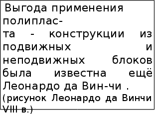 Блок, являющийся простей- шим механизмом, нельзя бы- ло изготовить достаточно де- шёвым способом, пока не по- явилось железо и в качестве матерьяла и как орудие про- изводства. Как бы там ни бы- ло, но появление блока вско- ре вызвало коренной переворот в области строительства. Он по-зволил поднимать и укладывать на место камни гораздо произ-водительнее, чем с помощью практиковавшегося в бронзовом веке способа их подъёма по земляной наклонной плоскости с по-следующим сбрасыванием на нужное место. Подвижные и неподвижные блоки позволяют в четыре, в шесть, в восемь раз “уменьшить” вес груза - для этого применя-ют устройсва из четырёх, шести, восьми блоков. Такие устройс-тва называют полипластами, что в переводе с греческого озна-чает “много тянуть”. Так вот при помощи таких машин, во вре-мена Витруовия строители поднимали огромные плиты, возво-дили гигантские сооружения. Приходилось ”много тянуть” за ве-рёвку, зато непосильный груз рано или поздно поднимали и ста-вили на место. Изобретение древних механиков дожило и до наших дней.