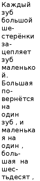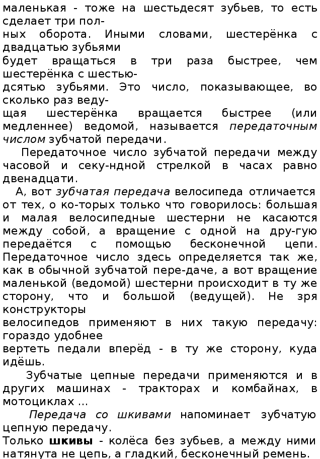 ЗУБЧАТЫЕ ПЕРЕДАЧИ И ШКИВЫ Почему они зубчатые, потому что колёса у них не гладкие, а с зубьями. А почему передачи, потому что передают вращение с одного вала (ведущего) на другой (ведомый). Зубчатыми передачами люди пользуются очень давно. Ещё в древнеримских водяных мельницах вращение от водяного коле-са передовалось жернову при помощи зубчатых колёс. На рисунке в старинной арабской книге можно увидеть, как вращение ветрянного колеса передается зубчатыми колёсами, дальше другогому механизму. А для чего нужно передавать вращение? Почему, например, автомобильный мотор не может сразу вращать колёса? Вал мотора делает около тысячи оборотов в минуту. Если бы колёса автомобиля всегда вращались так быстро, автомобиль мчался бы со скоростью 150 км/ч. Так ездить невозможно, даже по загородному шоссе. А уж в городе среди перекрёстков и све-тофоров шофёру то и дело приходится менять скорость. Для этого в каждом автомобиле имеются даже не две шестерёнки, а целая коробка зубчатых колёс. Так она и называется: коробка передач. Зацепляясь одна за другую, шестерёнки не только пере-дают вращение от двигателя колёсам, но и меняют скорость вра-щения. Те же самые шестерёнки могут вертеть колёса и в обрат-ную сторону - автомобиль пойдёт задним ходом. Как же работает пара шестерёнок? Прежде всего заметим, что если одна из них вращается по часо-вой стрелке, то вторая - обязательно против. Это значит, обыч-ная передача, состоящая из пары зубчатых колес, меняет враще-ние на противоположное. Нужно взять обязательно три, пять семь или вообще любое нечетное количество число шестерёнок, что-бы последняя вращалась в ту же сторону, что и первая. Предположим теперь, что первая из наших шестерёнок имеет шестьдесят зубьев, а вторая - двадцать. На сколько оборотов по-