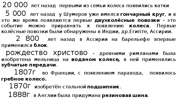 Что может быть проще колеса?! А между прочим, на создание этой простой и совершенной конструкции люди потратили не одну сотню лет. Зато попробуйте вспомнить сегодня машину в которой не было бы ни одного колеса.Чем же оно замечательно? Когда колесо поворачивается, то на его ось действует большая сила, чем на обод. Этот эффект используется для полуения выиг-рыша в силе, например в рулевом колесе. Чем больше руль, тем легче поворачивается его ось. При повороте оси колесо перево-дит вращательное движение оси в прямолинейное движение,бла- годоря чему с его помощью возможно перемещение грузов.Точ-ки обода колеса проходят большее расстояние, чем ось, так как диаметр колеса больше диаметра оси. Если взять, например, ствол толстого дерева, распилить его поперек несколько раз, то получим много деревянных дисков-кругляшек. Почему же мы говорим, что кругляшка не колесо? Потому что у колеса есть секрет,которого нет у кругляшки - дырка посередине. Этот пустяк превращеат обыкновенную круг-ляшку в настоящее колесо: дырка, о которой говорится располо-жена точно в центре окружности. Это значит, что колесо можно насадить на ось и заставить везти любой груз - в тачке или теле-ге... Только подумайте, что получилось бы, если бы дырка нахо-дилась не в центре, а где-нибудь сбоку? На таком кособоком ко-лесе далеко не уедешь: оно катится по ровной дороге, а ось то вверх то вниз подымается. Другое дело, когда ось посередине: центр окружности - замечательное место. От него до любой точ-ки окружности одно и то же расстояние - колесо катится, а ось всегда остается на одинаковой высоте от земли. Нет самое первое колесо было не просто придумать.И приспо-собить его к полезному делу - тоже было не просто.Как же это происходило? И на чём люди перевозили тяжести, до появления колеса. ПРЕДКИ КОЛЕСА На стенах дрвних египетских пирамид, сохранились надписи и изображения, повествующие о том, как строились эти фараоно-вы горы. На этих рисунках отчетливо видны люди, которые перевозят гигантский каменный блок , подложив под него круглые бревна-катки. Катить по каткам куда легче, чем волочить по земле. Бревна, по которым груз уже прокатился, перекладывают вперед, и та- ким образом процессия медленно продвигается.Недаром гово-рится : лучше круглое катить, чем плоское тащить. Между прочим, катки поныне применяются человеком для очень тяжелых грузов, которые не выдержит ни один колесный экипаж. Например, камень-постамент весом в полторы тысячи тонн для знаменитой статуи медного всадника в Петербурге тоже был доставлен на место с помощью своеобразных катков: ими служили чугунные ядра-шары, катившиеся по специальным лоткам. А когда-то катки были единственным средством для перевозки тяжестей. Каток - ближайший родственник колеса. Как же придумали катки? Сперва человек бродил поблизости от своего жилья. Со време-нем совершали все более дальние путешествия в поисках пищи. Еще позднее люди научились выдалбливать лодки из стволов толстых деревьев.Ученые утверждают, что прежде, чем ездить по суше, человек научился плавать в лодках. Иногда подходящее дерево для такой лодки росло далеко от берега. Как доставить его к реке? Снаала, наверно люди обламывали и обрубали сучья на дереве, чтобы те не мешали вытаскивать из лесу ствол, и сообща волок-ли его по земле. Но однажды заметили, что тащить становитс