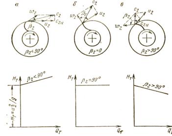 1. Теоретические характеристики 2. Действительная индивидуальная характеристика. 3. Характеристика внешней сети. 4. Режим работы центробежного вентилятора. 1. Теоретическая индивидуальная характеристика турбомашины представляет собой зависимость между теоретическим напором Нт и теоретической подачей Qт при известных размерах турбомашины и определенной частоте вращения ее рабочего колеса. Лопасти рабочих колес центробежных колес могут быть: 1) загнутые вперед, когда В2<90, т.е. ctg>0 (рис. а) 2) радиальные, когда В2=90, т.е. ctg=0 ( рис.б ) 3) загнутые назад, когда В2>90, т.е. ctg<0 ( рис. в )