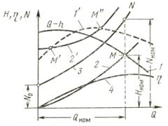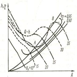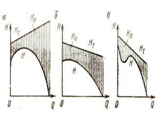 характеристики вентилятора можно получить, если из ординат теоретического напора Нт вычесть ординаты потерь напора Нп при соответствующих подачах. Сравнение форм действительных индивидуальных характеристик вентиляторов, имеющих рабочие колеса с лопастями, загнутыми вперед (а) и назад (б), показывает что первая характеристика имеет вид выпуклой кривой (горбатые характеристики), а вторая – падающей кривой (безгорбые характеристики) или имеет слабо выраженный горб. Действительная индивидуальная характеристика осевой турбомашины (в) имеет форму седлообразной кривой. Каждому углу установки лопаток соответствует соответствующая характеристика. Наиболее устойчивый режим работы имеет вентилятор с лопатками установленными под углом 15-20*, при угле установки меньше 20* вентилятор развивает невысокую производительность и имеет низкий К.П.Д. При углах более 20* характеристика принимает седлообразную корму, которая не обеспечивает устойчивою работу вентилятора особенно при параллельной работе вентиляторов на общую сеть.