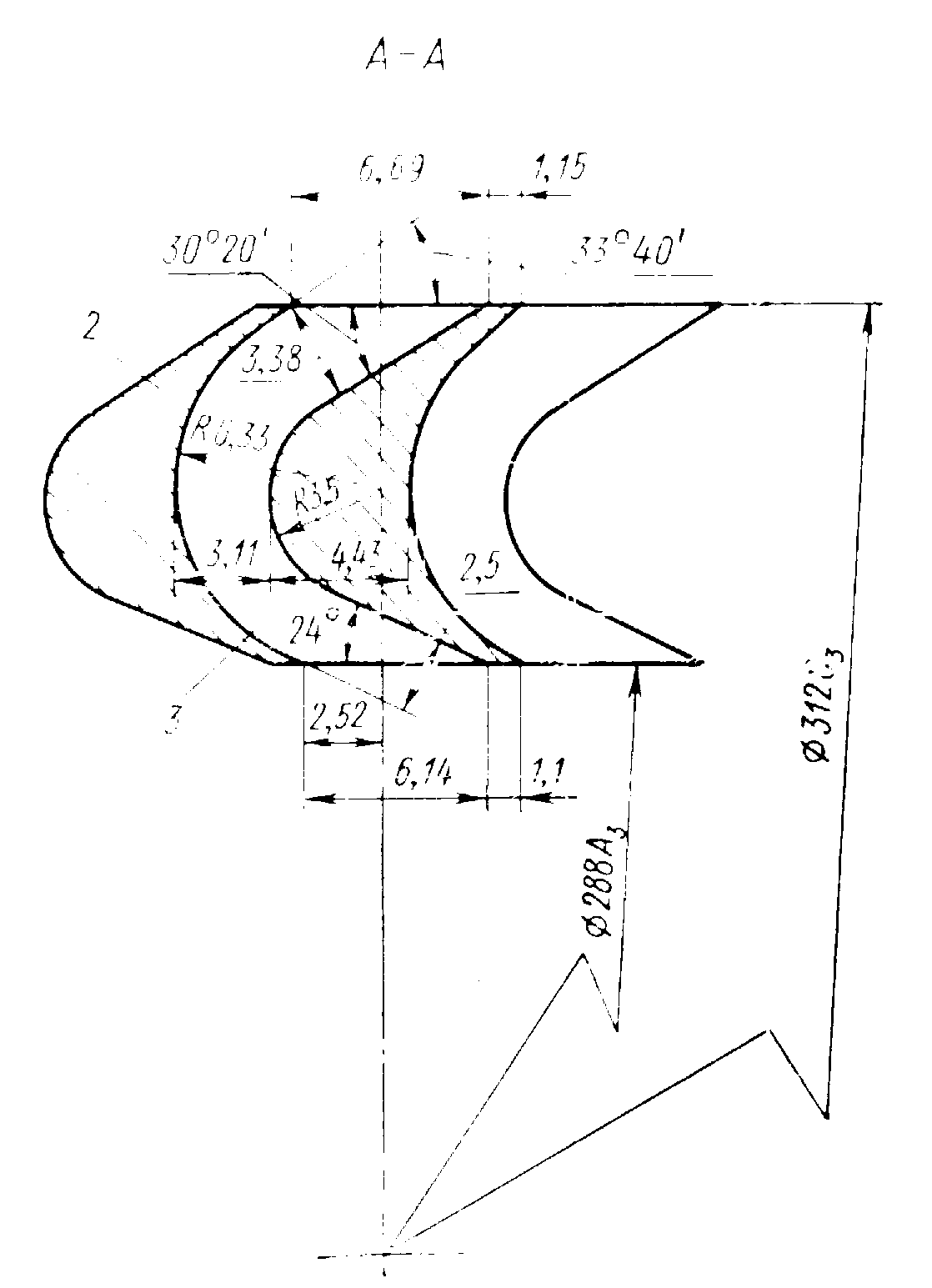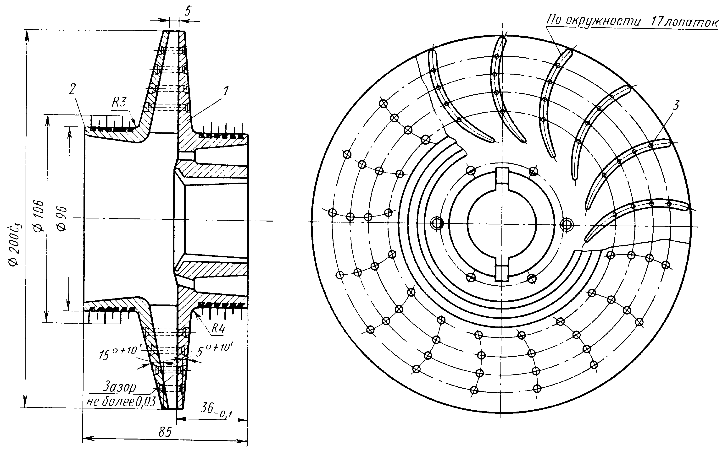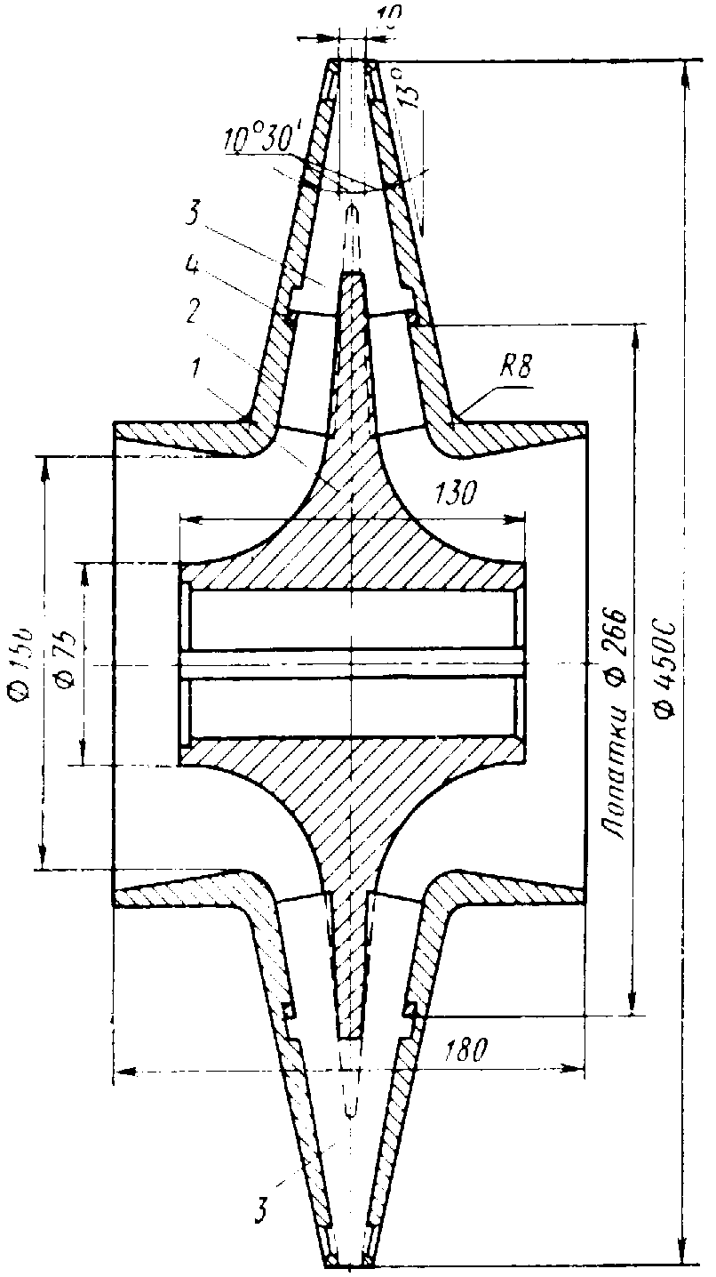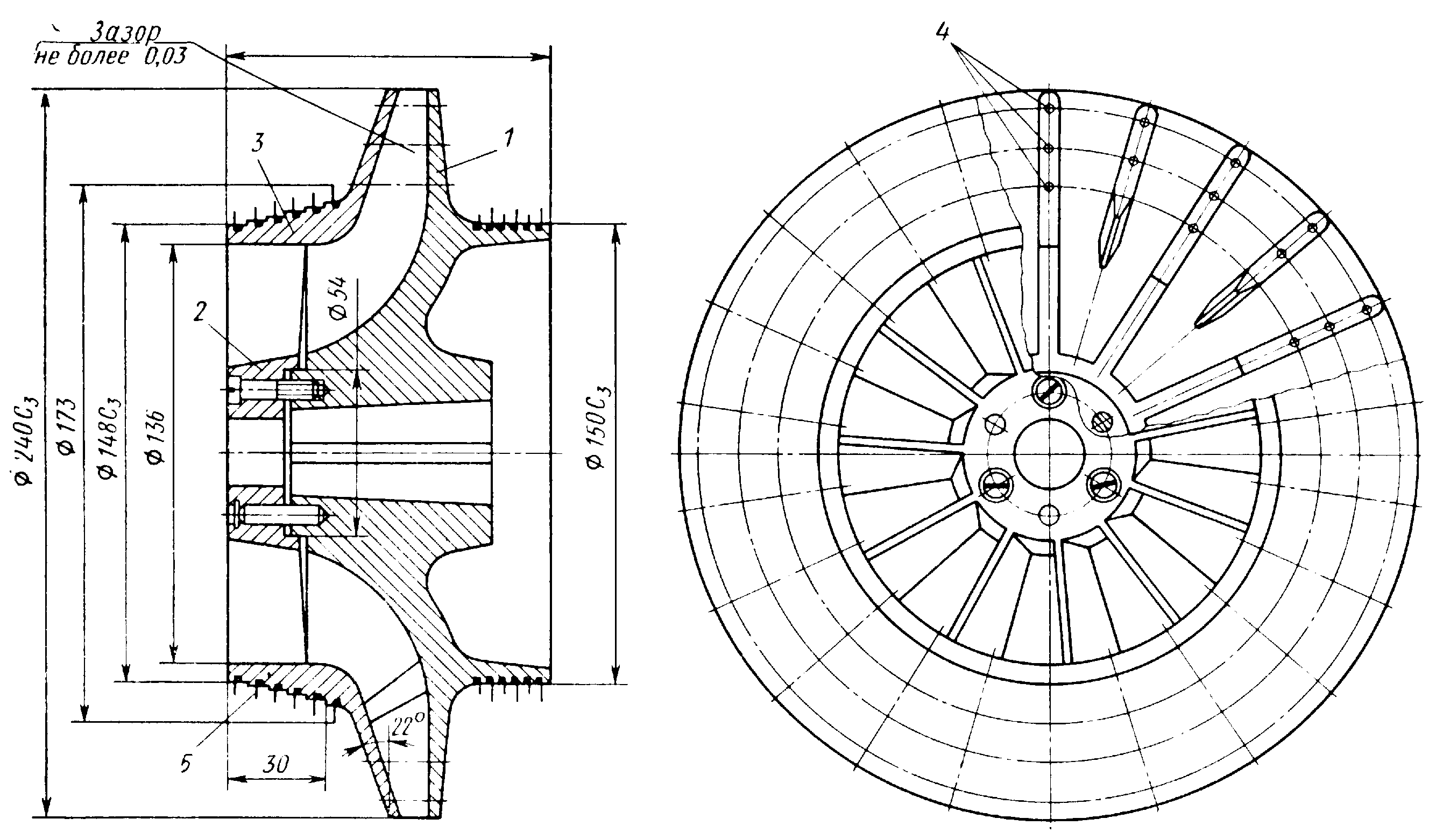 П Колесо состоит из стрелки, в прорези которой вставляются лопатки, изготовленные из листовой стали. В средней части лопаток имеются заплечики, входящие в кольцевые пазы покрывных дисков, а в верхней части - выступы, которые расклепываются в прорезях покрывных дисков. Для предотвращения смещения и вибрации лопаток заплечики вводятся в кольцо с прорезями. Число лопаток в колесах такой конструкции было значительным - 36 длинных и 36 коротких. Стрелка и покрывные диски изготовлялись из поковок нержавеющей стали, а лопатки из листового проката этой же стали. Рис. 1, Рабочее колесо реактивного турбодетандера с двухсторонним выходом газа: 1 - стрелка; 2 - покрывные диски; 3 - лопатки; 4 – кольцо Ввиду того, что подобные колеса имеют значительный вес, располагаются в средней части ротора и удалены от опор, критическое число оборотов ротора обычно бывает ниже рабочего числа оборотов, т. е. вал получается «гибким». Для предотвращения значительных колебаний и больших прогибов вала при переходе через критическое число оборотов одну опору снабжают демпфирующим устройством. В современных турбодетандерах обычно применяются закрытые и полуоткрытые рабочие колеса с односторонним выходом газа, расположенные на консоли вала. Закрытое рабочее колесо с односторонним выходом газа (рис. 2) состоит из покрывного и лопаточного дисков, соединяемых заклепками. Лопаточный диск может изготовляться фрезерованием, штамповкой или методом точного литья по выплавляемым моделям. Однако, ввиду того, что количество выпускаемых однотипных рабочих колес сравнительно невелико, обычно лопаточные диски выполняются фрезерованием. Оба диска изготовляются из поковок алюминиевого сплава марки АК6. Заклепки, соединяющие диски рабочего колеса, изготовляются из алюминиевого сплава марки В65.